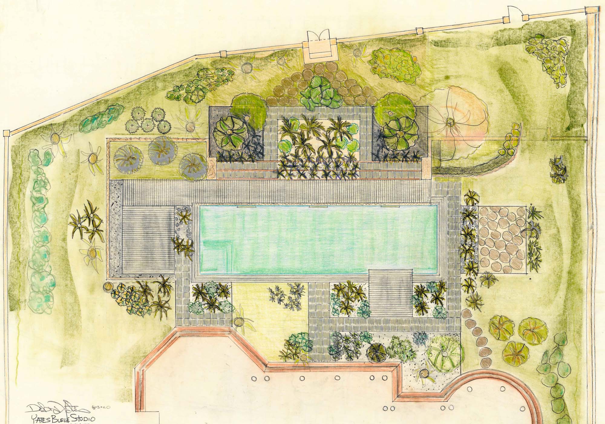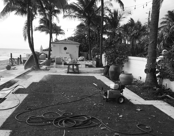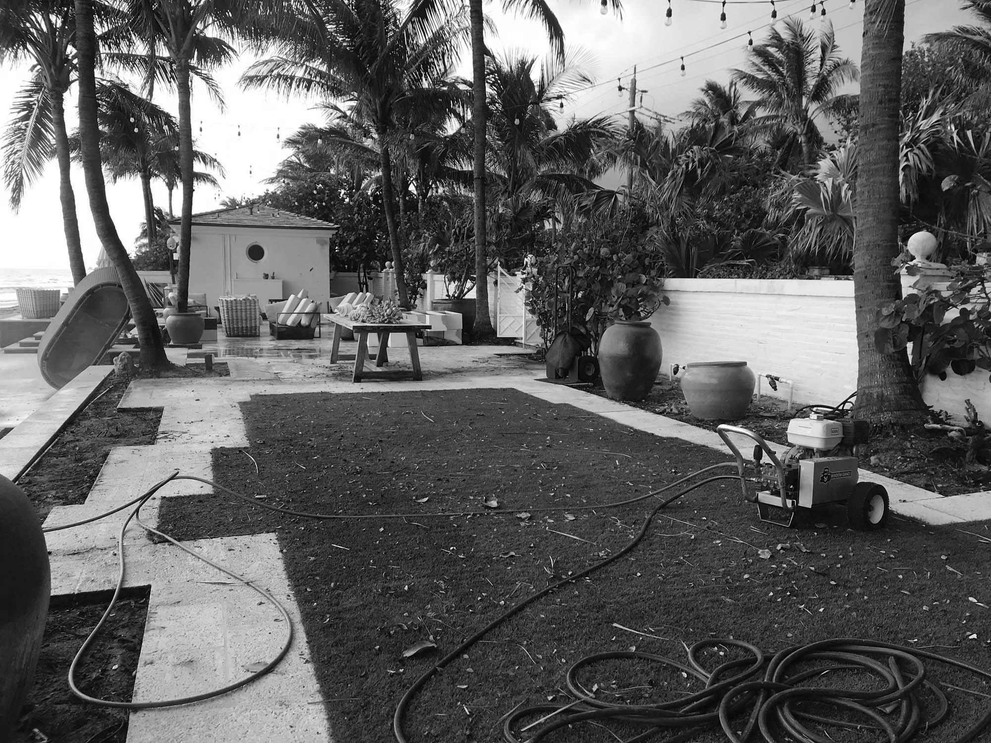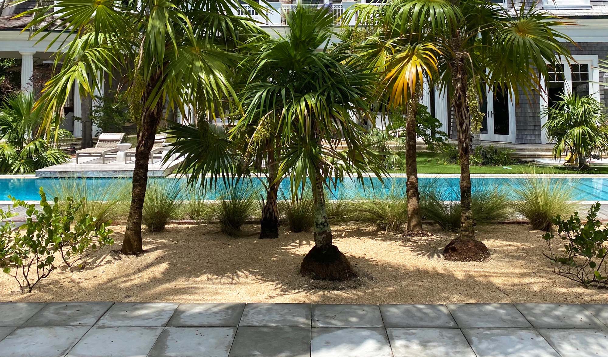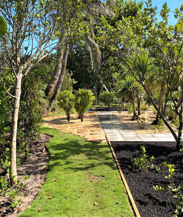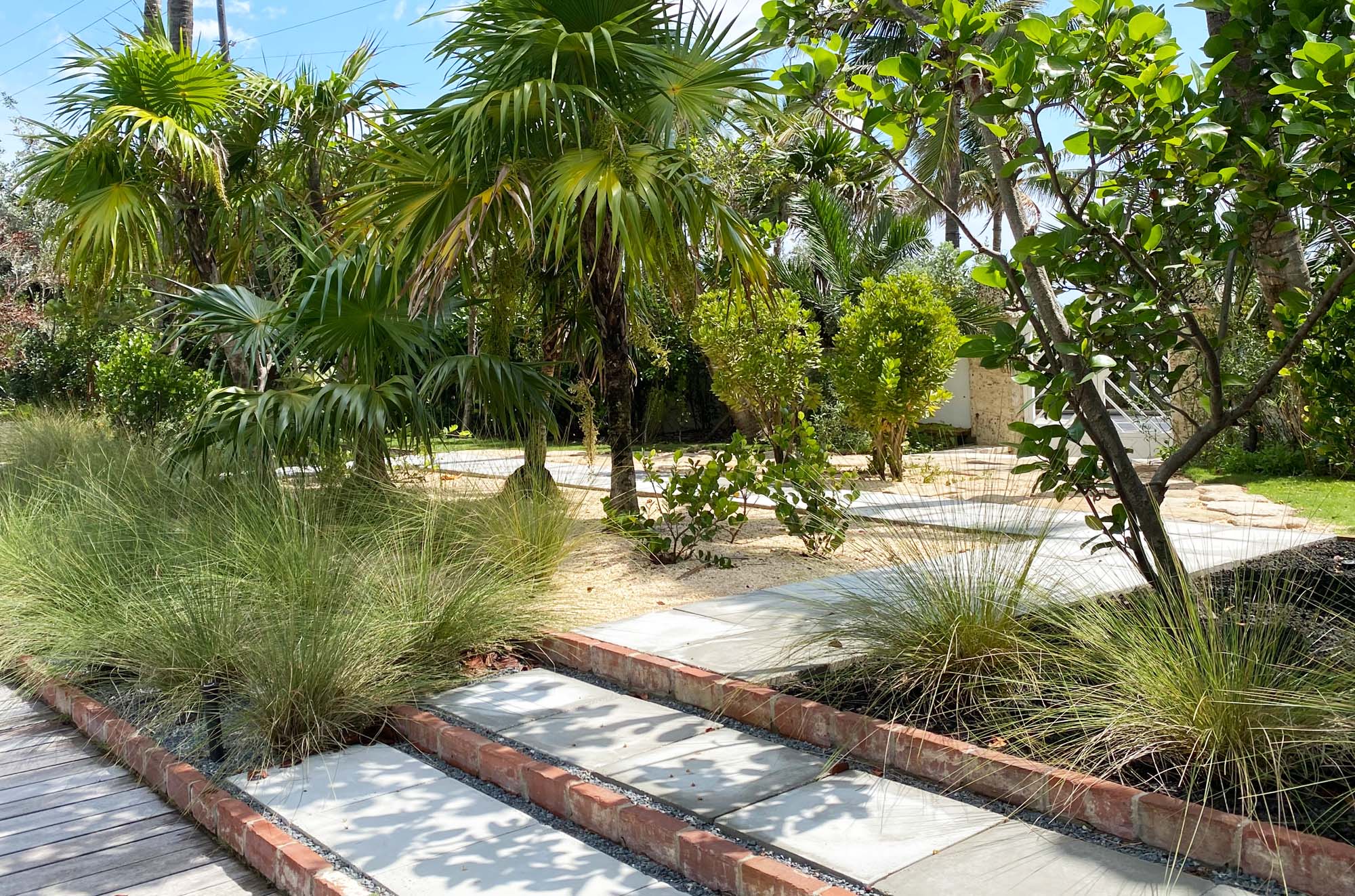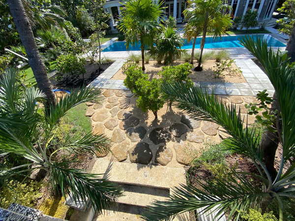 Coquina sand and gray granite gravel replace the existing hedges and fake turf that