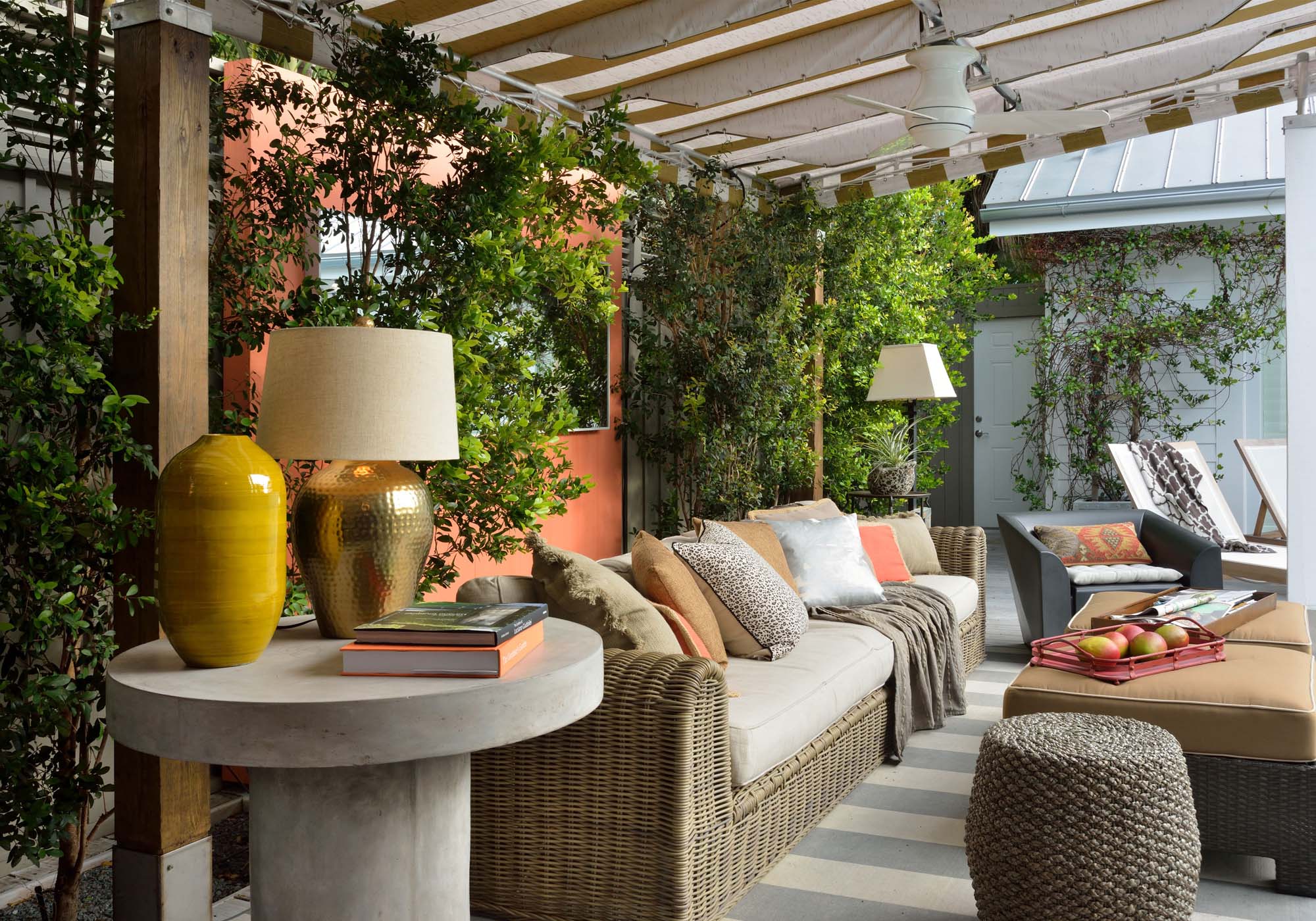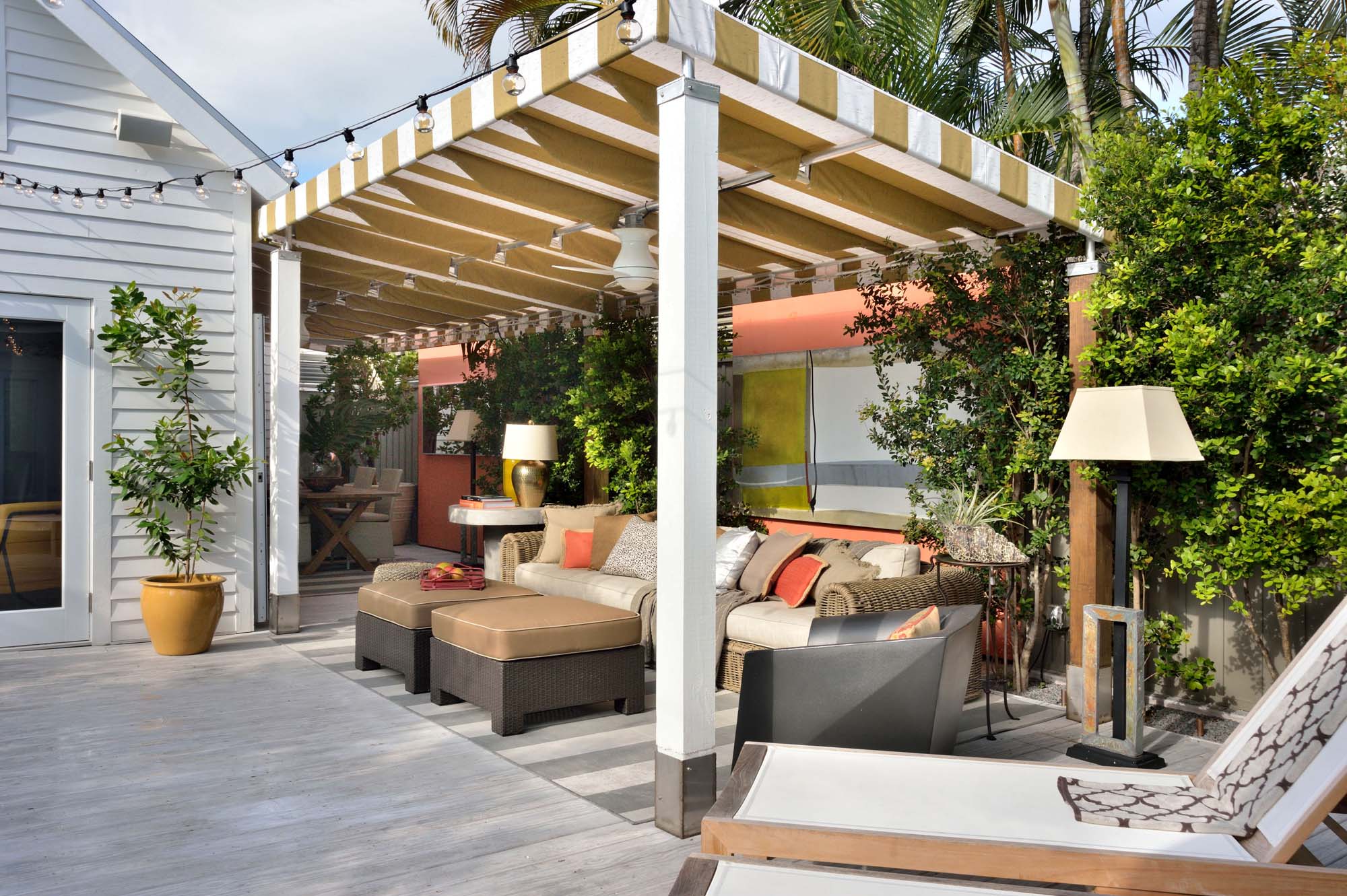 over sized pots and trellised to soften the space.
